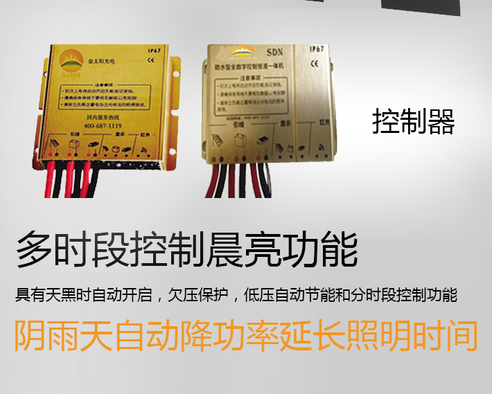 金太陽光電控制器——智能多時(shí)段控制器 ,天黑時(shí)自動(dòng)開啟、欠壓保護(hù)、低壓自動(dòng)節(jié)能 和分時(shí)段控制陰雨天自動(dòng)降功率延長(zhǎng)照明時(shí)間,支持遠(yuǎn)程無線控制;